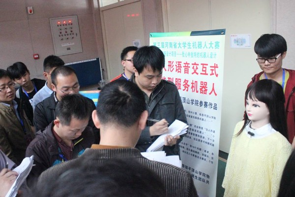 由我校开元平台(中国)科技公司与电气与机械工程学院学生组成的13支参赛队伍分别参加了机器人越野游、机器人创新设计、双足竞步、灭火机器人、武术擂台非标无差别、微软武术擂台仿真等六个项目的竞赛。经过激烈竞争,由冯翔彬、刘惠婷、刘学宾组成的“梦之翼队”和刘学宾、郭俊晓、沈才华组成的“胜羽队”分别获得“机器人创新设计”和“微软武术擂台仿真”项目一等奖,另有4支队伍获得二等奖、5支队伍获得三等奖。其中,由“胜羽队”设计的仿人形语音交互式机器人“小慧”,有着乌黑亮丽的长发、齐齐的刘海,大眼睛双眼皮,声音不紧不慢,举手投足充满淑女范儿,给现场观众及比赛选手留下了深刻印象,受到了评委的好评,展现了我校学生扎实的专业功底和丰富的想象力与创造力。